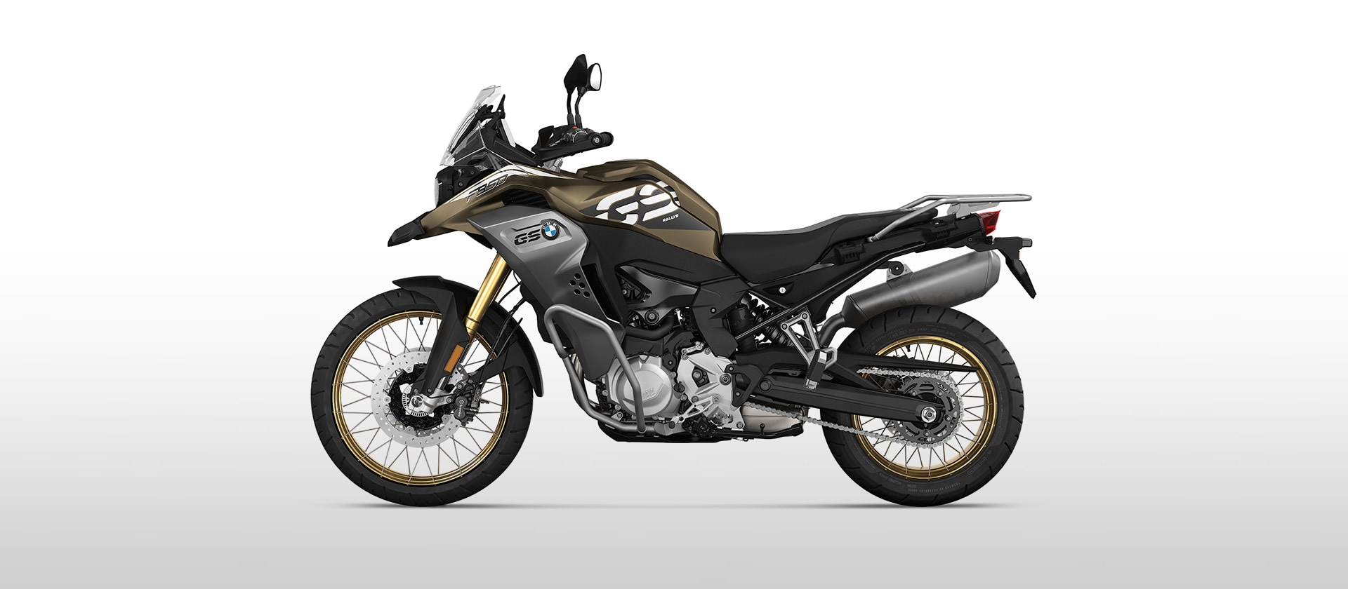 La conexión más corta entre la salida y la diversión: la F 850 GS Adventure Rallye en color Kalamata metalizado mate 2 con llantas anodizadas en oro y tubos de horquilla dorados.